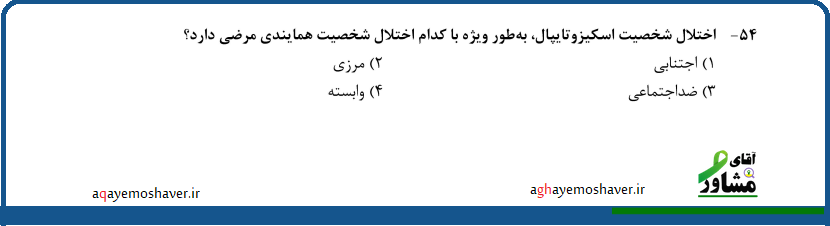 گزینه سازمان سنجش 1 می باشد. اختلال شخصیت اسکیزوتایپال به طور ویژه با اختلال شخصیت اجتنابی (Avoidant Personality Disorder) و همچنین با اختلال شخصیت مرزی (Borderline Personality Disorder) همایندی مرضی بالایی دارد.