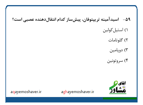 گزینه 4 صحیح است. اسید آمینه تریپتوفان پیش ساز انتقال دهنده عصبی سروتونین است. 5-HTP خود نیز یک آمینو اسید است که بدن به طور طبیعی آن را تولید میکند و در فرآیند تبدیل ال تریپتوفان به سروتونین، که یک نوع انتقال دهنده عصبی مهم است، نقش اساسی ایفا میکند. سروتونین یک انتقال دهنده عصبی مهم است که در تنظیم خلقوخو، خواب، اشتها، یادگیری و حافظه نقش دارد.