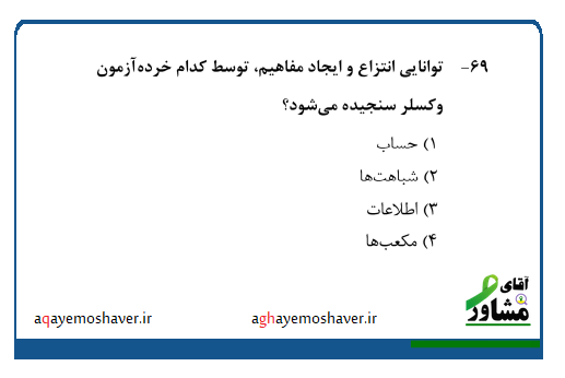 گزینه 2 صحیح است. در میان خردهآزمونهای وکسلر، خردهآزمون "شباهتها" اصلیترین و مستقیمترین ابزار برای سنجش توانایی انتزاع و استدلال مفهومی است.