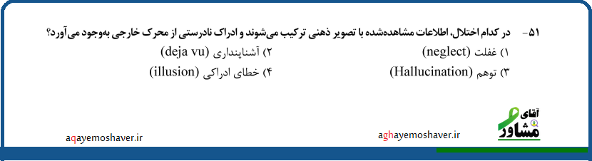 گزینه 4 صحیح است. خطای حسی(خطای ادراکی) (illusion) : ادراک نادرست از محرک خارجی. زمانی رخ میدهد که فرد اطلاعات حسی واقعی را به نادرستی تفسیر میکند.