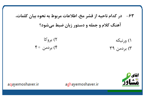 گزینه 2 صحیح است. اطلاعات مربوط به نحوه بیان کلمات، آهنگ کلام و دستور زبان در ناحیه بروکا (Broca's area) در مغز ضبط میشود. ناحیه بروکا در قسمت جلویی نیمکره چپ مغز واقع شده است و نقش مهمی در تولید گفتار و بیان کلمات دارد. این ناحیه به ویژه در تنظیم ترتیب کلمات و ساختار جملات بر اساس دستور زبان نقش دارد.