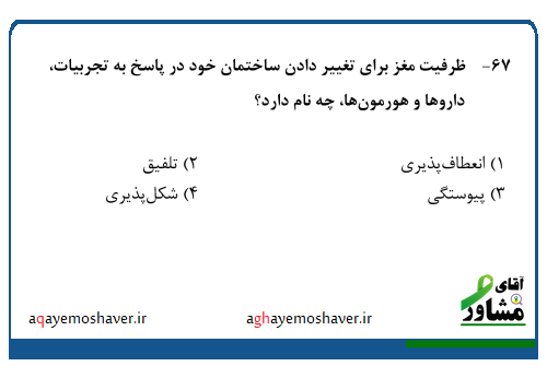 گزینه 1 صحیح است. ظرفیت مغز برای تغییر دادن ساختمان خود در پاسخ به تجربیات، داروها و هورمونها به نام “انعطافپذیری مغزی” یا پلاستیسیته مغزی (Neuroplasticity) شناخته میشود. این توانایی به مغز امکان میدهد تا به تغییرات محیطی، یادگیری و تجربهها پاسخ دهد و خود را تطبیق دهد.
